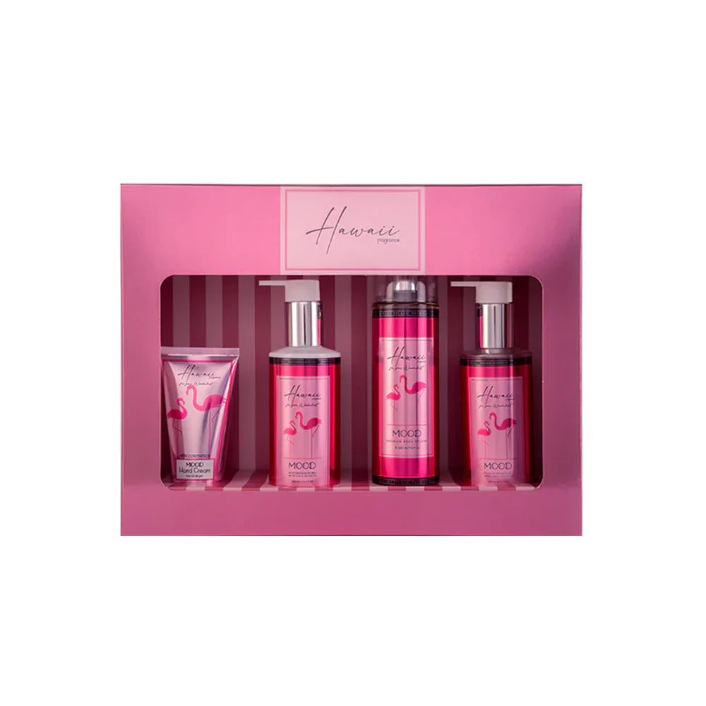 MOOD Hawaii woman set ( Body Splash 220 ml – Hand Cream 50 ML – Shower Gel 200 ML – Body Milk 200 ML), curated to pamper and indulge your senses from head to toe. This exquisite set includes three essential products designed to nourish, refresh, and moisturize your skin, leaving you feeling rejuvenated and beautifully scented. MOOD Hawaii woman set contains: