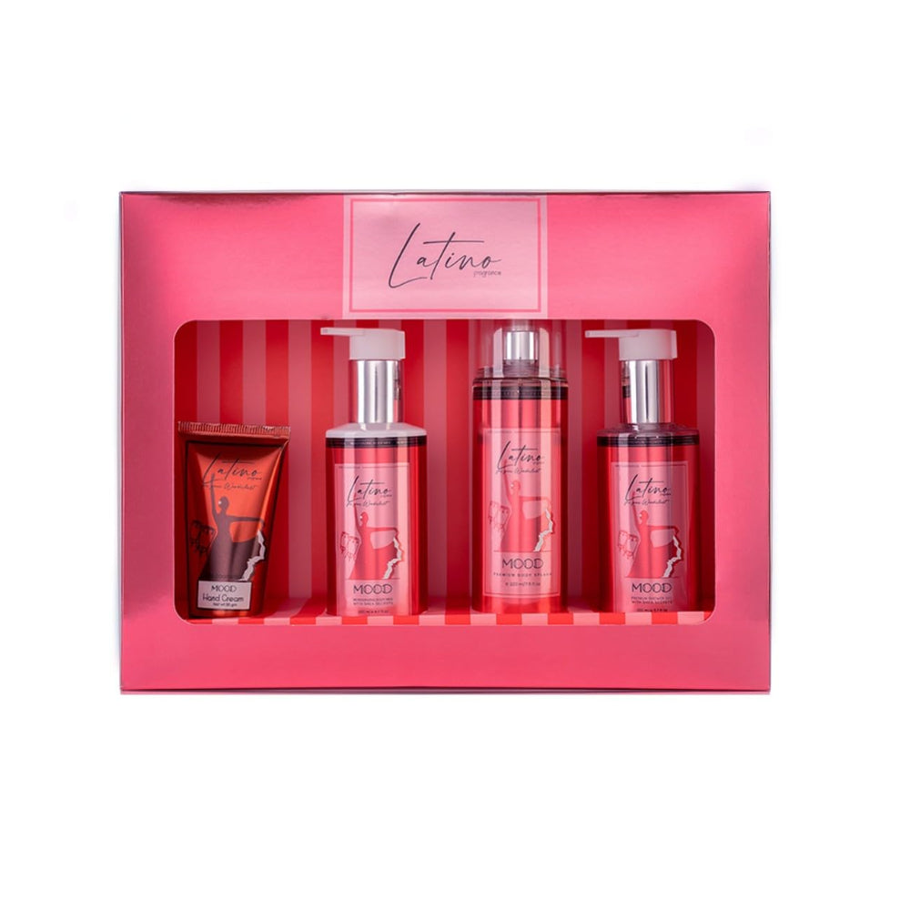 MOOD Latino woman set ( Body Splash 220 ml – Hand Cream 50 ML – Shower Gel 200 ML – Body Milk 200 ML), curated to pamper and indulge your senses from head to toe. This exquisite set includes three essential products designed to nourish, refresh, and moisturize your skin, leaving you feeling rejuvenated and beautifully scented. MOOD Latino woman set contains: